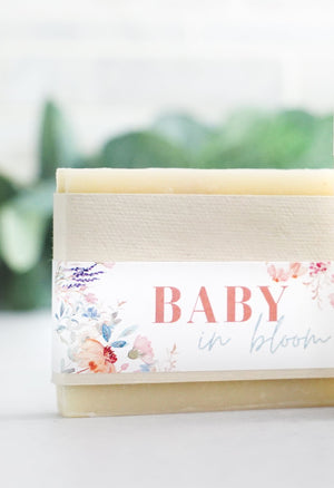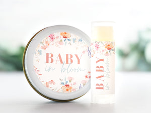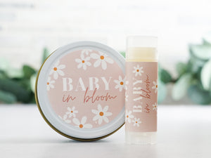 These Baby in Bloom shower favors are made with natural ingredients. Candle tins, handmade natural soaps, and lip balms all in stock and available to ship now in three scents: lavender, clementine, and peppermint. Choose between two themes of packaging to align with your baby shower decorations Wildflower or Retro daisy.